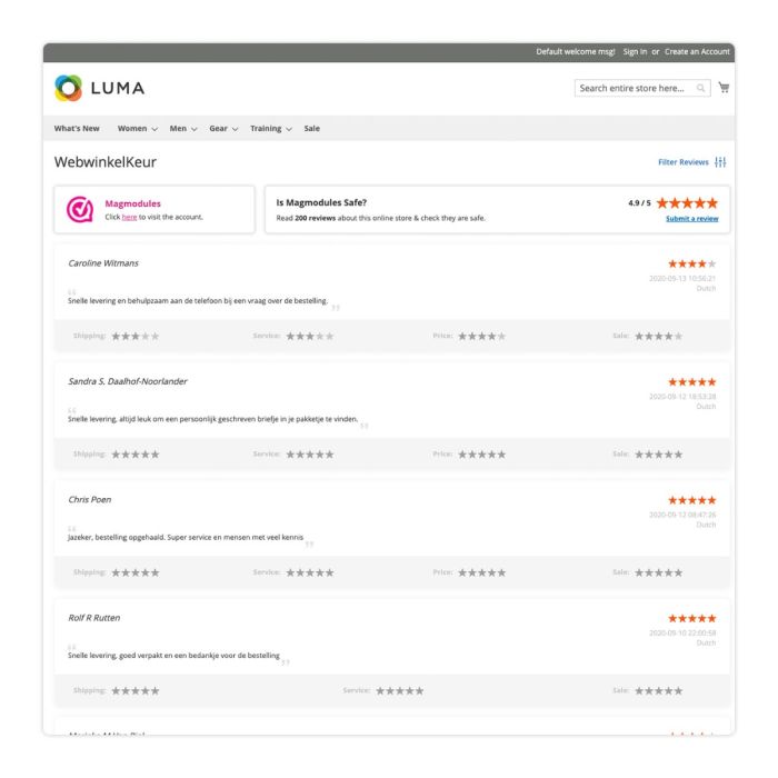 In addition, Magmodules provides excellent customer service. In short, we wholeheartedly recommend this plugin to other Magento 2 webshops. It has greatly enhanced our online presence and boosted customer trust, which is invaluable. This plugin outperforms and offers more functionalities compared to the standard WebwinkelKeur plugin.